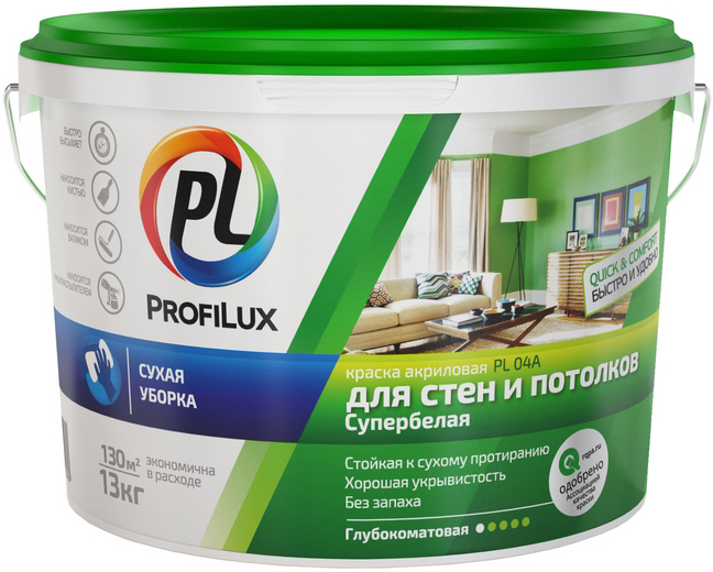 Краска ВД Profilux PL-04A акриловая для стен и потолков супербелая (ЗИМА) 1,4кг (6шт/уп,384шт/пал)
